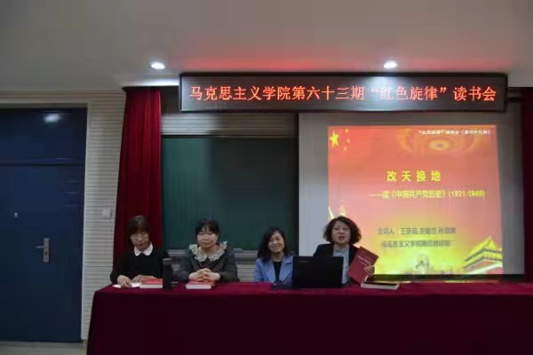 【新闻中心讯】4月15日晚7:00,由马克思主义学院主办,马克思主义研究会承办的第六十三期“红色旋律”读书会在我校人文馆M502举行。本期主题是“改天换地——读《中国共产党历史》(1921-1949)”,由马克思主义学院王彦霞、孙翠娟、关丽兰老师主讲。