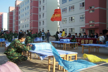 【新闻中心讯】10月20日下午,材料学院2007级军被大赛在十组团天井举办,学院团委书记郭宇星老师、2007级辅导员杨博涵老师出席并担当了评委,学院六个班级选送的近50名同学参加了本次大赛。比赛本着“引导学生养成积极的生活态度和紧张有序的生活习惯”的宗旨,以比赛兼文娱节目新颖的形式吸引了我院和其它学院的广大同学驻足观看。