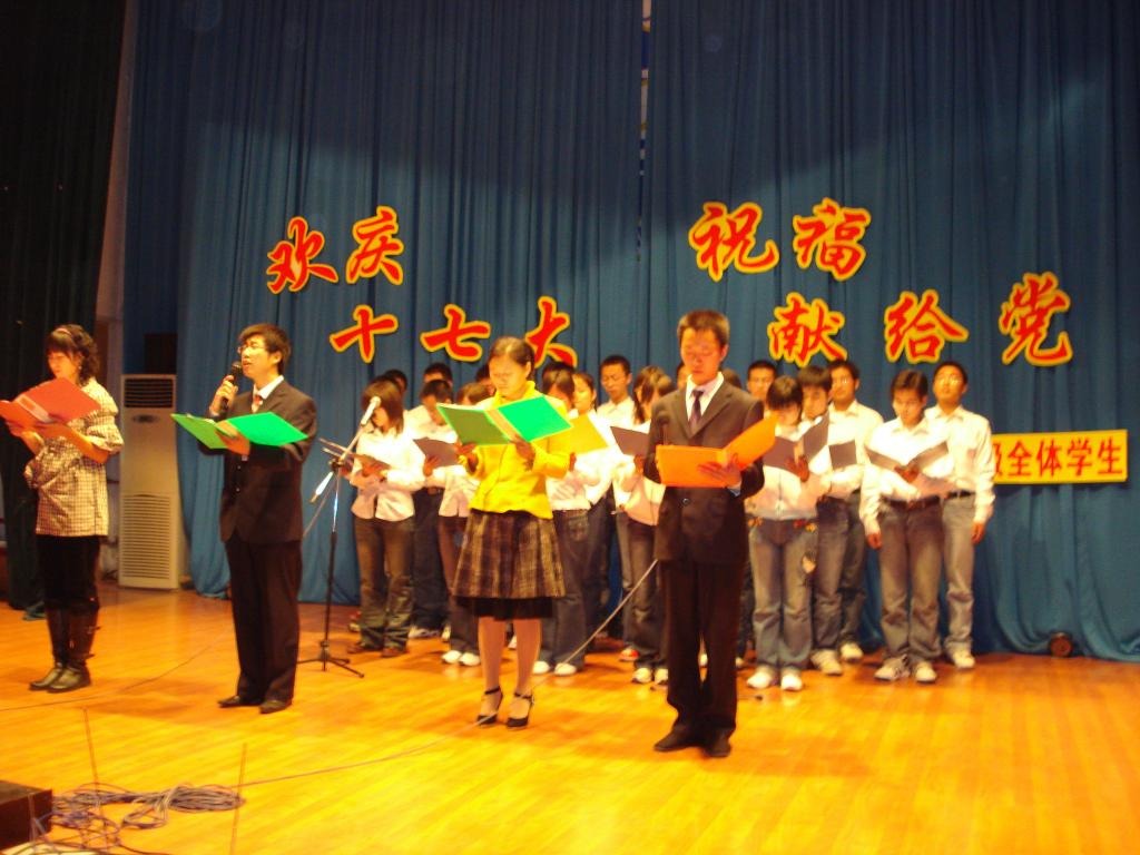 族巨大的凝聚力;05级电气专业自编自导自演的舞台剧《党旗》,则讲述了抗日战争时期八路军战士护送一面党旗的英雄故事,烈士们的英雄壮举通过 六位学生深情演绎出来,无不让在座的观众深感幸福生活的来之不易;歌曲串烧中一曲《中国人》,激情的演唱,再加上精湛的武术表演,不仅赢得了观众阵阵掌声,更使在座的每个人热血沸腾、豪情万丈;自动化专业的合唱《长征》,则把大家带到了那个战火纷飞、艰苦卓绝的年代,再一次重温了不朽的长征精神;此外,在古筝《瑶族舞曲》、独唱《我和我的祖国》、相声《行业术语》、歌曲《家乡》等节目中,同学们用情表演,观众们用心感受,都给大家留下了难忘的印象。而测控专业学生原创的一首诗朗诵《大国的崛起》,不仅让大家感受到国家的振兴与强盛,也深深的体味到当代大学生对祖国的一片赤诚之心,将整个汇演的现场气氛推向了最高潮。
