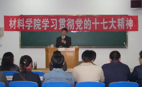 【新闻中心讯】10月25日16时,材料科学与工程学院在西校区第三教学楼206教室召开了专题学习会,特邀文法学院政治系主任石敦国副教授为学院全体教师和学生代表解读党的十七大报告和会议精神。会议由学院党委书记王丽萍主持。