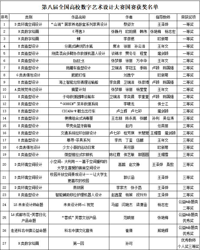 【新闻中心讯】在第八届全国高校数字艺术设计大赛国赛中,我校艺术与设计学院斩获一等奖5项,二等奖7项,三等奖13项,优秀奖2项,共获得国赛奖27项,其中,艺术与设计学院教师王年文、欧新菊、张艳梅、杨志宏、王泽烨、扈剑颖等指导的的学生作品获得一等奖;卢颖、侯士江等老师指导的学生作品获得二、三等奖及优秀奖;孙可老师获得优秀教师个人奖三等奖。燕山大学获得第八届全国高校数字艺术设计大赛“卓越贡献奖”。