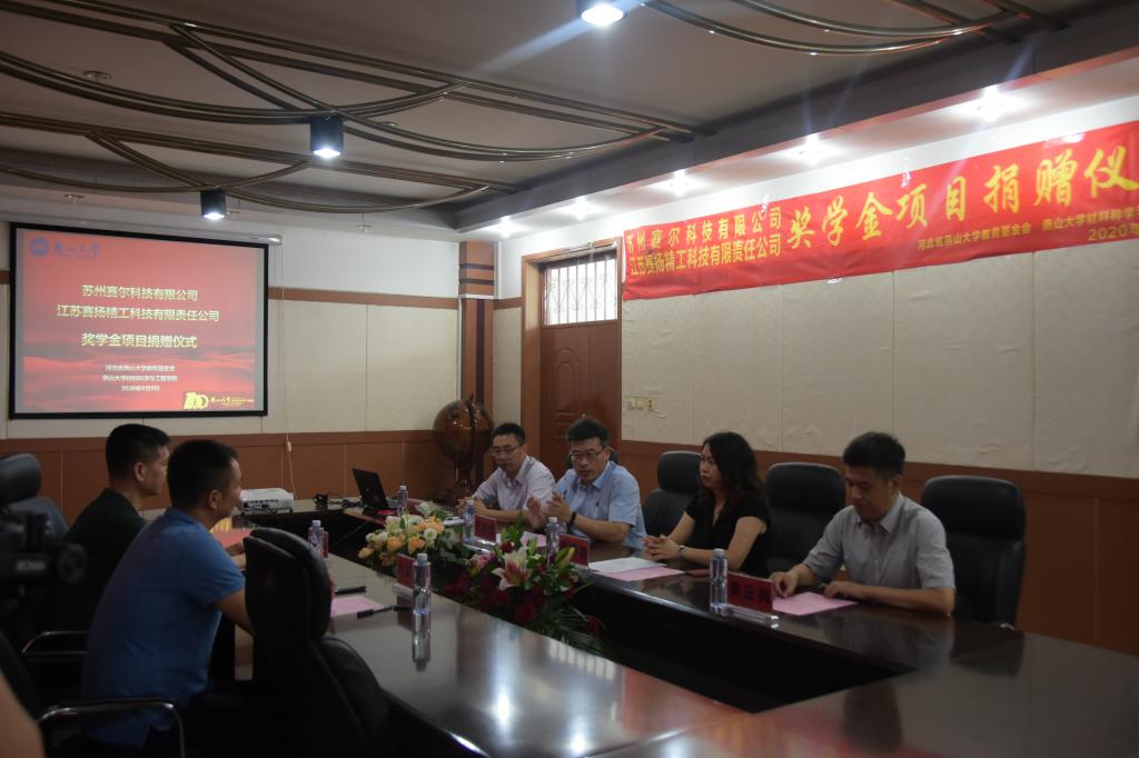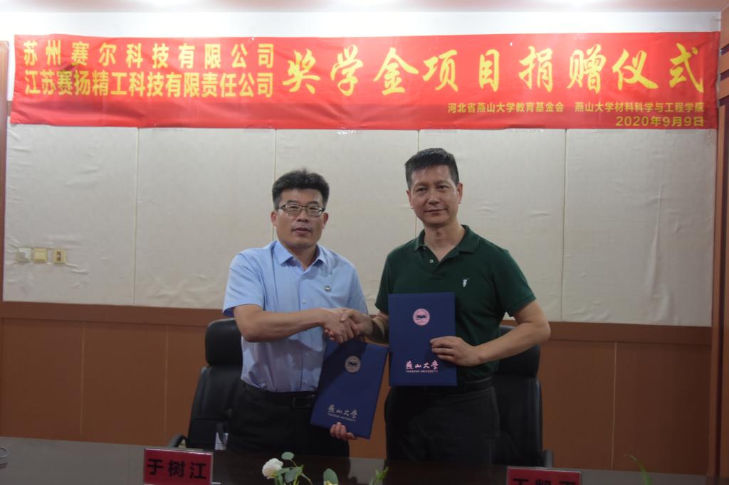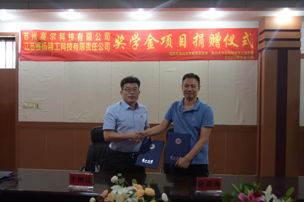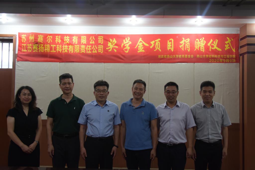 【新闻中心讯】9月9日下午4:30,江苏赛扬精工科技有限责任公司、苏州赛尔科技有限公司奖学金项目捐赠仪式于材料A馆325室举行。燕山大学党委常委、副校长于树江,江苏赛扬精工科技有限责任公司总经理王凯平,苏州赛尔科技有限公司总经理冉隆光,材料科学与工程学院院长王利民、党委副书记袁云岗等出席了捐赠仪式,捐赠仪式由材料科学与工程学院党委书记李曦达主持。