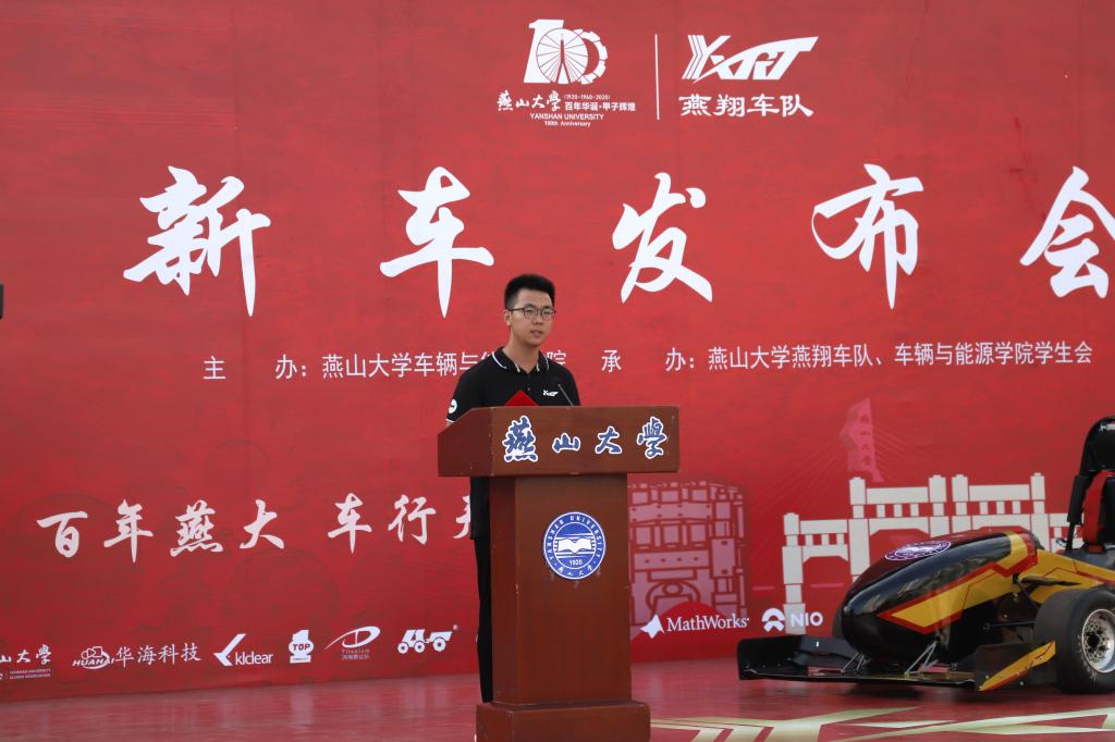 燕翔车队队长杜云浩在新车揭幕仪式后上台发言,表达了对所有领导、赞助商和校友的感谢,介绍了新车的构造、性能和自主设计部分。在发言最后他表明了今后燕翔车队的发展方向及对未来的期许。