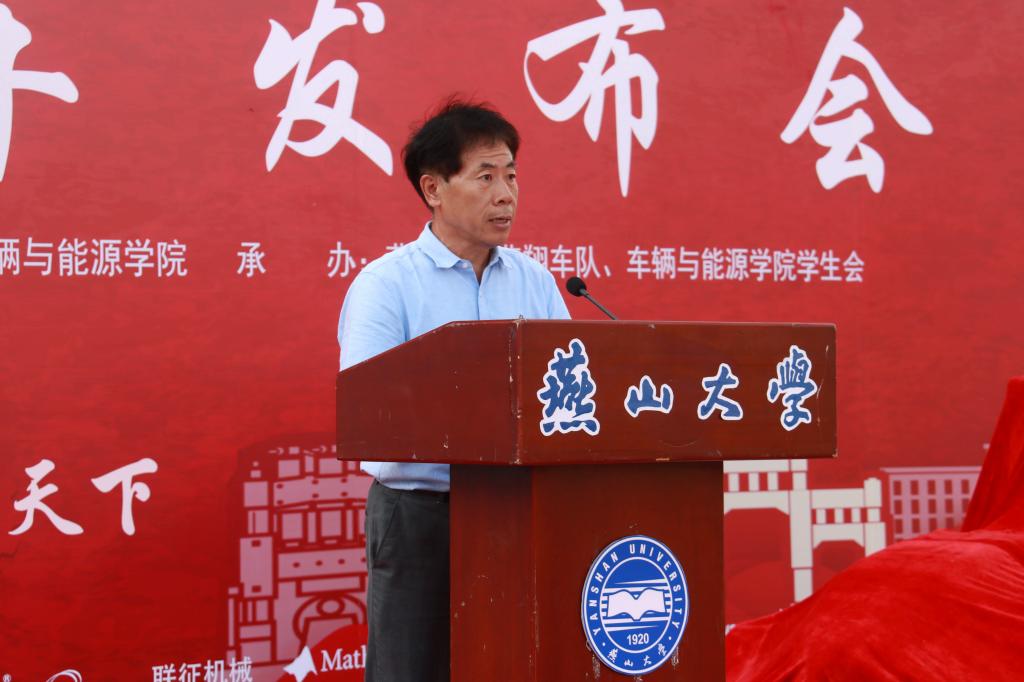 团委书记薛传佳、学生工作处处长蔡星周、招生就业处处长张红兵、燕山大学科技园主任冯智恩、教务处副处长齐跃峰、秦皇岛燕大汽车零部件制造有限公司副总经理李立业、车辆与能源学院院长金立生上台,共同为燕翔十号(校庆版)新车揭幕,新车炫酷的外表赢得了领导们的赞许和台下师生的热烈掌声。