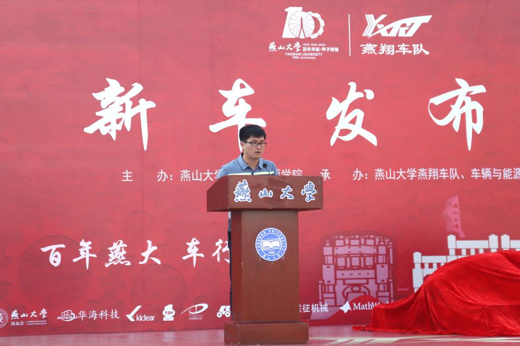 新车的发布正值百年校庆之际,原燕翔车队的校友代表,中国一汽研发总院试验所整车性能试验工程师景猛回顾了车队成立之初面临的机遇与挑战,讲述了自己在车队拼搏与付出的点滴经历,令人敬佩与动容。在发言的最后,向学校领导和老师们表达了多年培养的感谢,并为母校百年校庆和燕翔车队送出美好的祝愿。