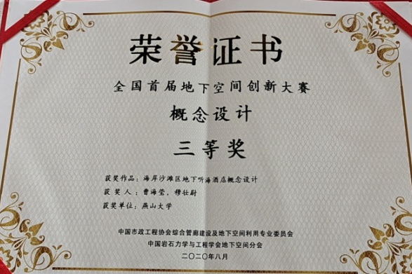 【新闻中心讯】8月20日-21日,在长沙举办的全国首届地下空间创新大赛暨地下空间创新发展高峰论坛中,燕山大学建筑工程与力学学院曹海莹老师与其硕士研究生穆壮尉共同完成的设计作品“海岸沙滩区地下听海酒店概念设计”,从全国700余份作品中脱颖而出,获得大赛三等奖。国家最高科学技术奖获得者钱七虎院士和全国工程勘察设计大师陈志龙为获奖者颁奖。