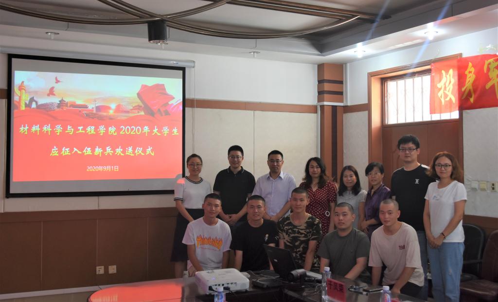 【新闻中心讯】9月1日上午11时,材料科学与工程学院2020年大学生应征入伍新兵欢送会在材料A馆325室举行。本次欢送仪式由学院副处级辅导员王亦晨主持,学院党委书记李曦达、院长王利民、金属材料工程系主任李艺君、金属材料工程系党支部书记冯士东、无机非金属材料工程系党支部书记于凤荣、高分子材料工程系主任彭桂荣以及学院学生工作办公室部分辅导员、在校的预备入伍学生以及学生代表出席本次欢送会。