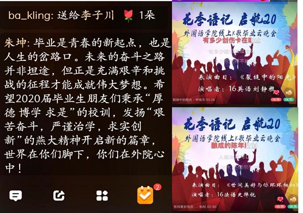 【新闻中心讯】凤凰花开,骊歌响起。6月21日晚19点,外国语学院“花季语记,启航20”毕业云晚会拉开帷幕。毕业生们通过“全民k歌”平台一展歌喉,声如天籁,将浓浓的思绪和不舍寄托于歌曲中,告别母校,也告别大学四年的时光。学院领导、教师代表也参加了云晚会,并为毕业生们送去祝福,愿毕业生们携梦想同行,开启人生新的征程。