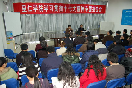 【新闻中心讯】11月30日下午2:30,里仁学院党委举行了学习贯彻十七大精神专题报告会,里仁学院领导及全体副科级以上干部、党支部书记参加了会议。报告会由党委书记刘新民主持,,由文法学院政治系主任石敦国主讲。