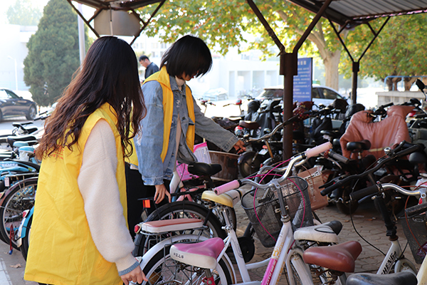 志愿者们正在摆放自行车
