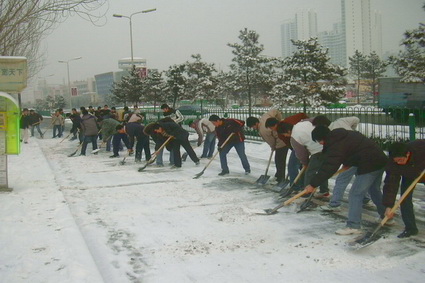 【新闻中心讯】07年12月28日,秦皇岛市迎来了入冬以来的第一场瑞雪,大雪纷飞,景象喜人。虽说瑞雪兆丰年,但大雪同时也给我们带来了交通不便,行人易摔等许多问题。雪停后, 机械工程学院的04、05级学生党员对燕大正门至铁三处十字路口段人行道、自行车道的积雪进行了清扫。