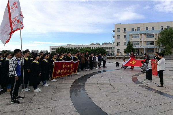 早上6:40,随着慷慨激昂的国歌旋律,伴着晨起阳光的照耀,五星红旗缓缓升起,同学们在庄严肃穆的气氛中,共同回忆历史,缅怀先辈,也倍加珍惜和平时代下的幸福生活。之后的毕业生党员重温入党誓词、新接收发展党员入党誓词环节,在李伟的领誓下,参加仪式的全体党员面向党旗,庄严宣誓,短短一百多字的誓词是他们的决心,又是对党的事业忠诚的宣誓,更是对老师和同学们表明今后学习、工作和生活态度。随后,毕业生党员代表、材料科学与工程学院本科生第一党支部副书记余诺婷代表毕业生党员发言,她带领大家共同回忆了2019届毕业生们难忘的四年大学生活,对辛勤工作、无私奉献的领导和老师们表示深深的感谢和崇高的敬意,代表毕业生党员表示要牢记“厚德•博学•求是”的校训,积极拥抱新时代、奋进新时代,走好这一代人的长征。在最后的“毕业寄语”环节,李伟对广大毕业生提出了殷切的嘱托:希望广大毕业生能够自觉提升自身理论修养,弘扬燕大人的“艰苦奋斗、严谨治学、求实创新”的光荣传统,把个人梦想汇入时代洪流,积极投身创新创业,勇于参与社会实践活动,做到知行合一、以知促行、以行求知,为实现中华民族伟大复兴的中国梦而努力奋斗。