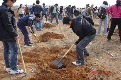 在辅导员的率领下,刚一到事先分好的植树地点,同学们就争相拿起工具热火朝天的干起来。大家三人一伙,两人一组,忙得不亦乐乎。虽然弄得满身是土,有的同学还划破了手,然而热情依然不减,兴奋之情溢于言表。有的辅导员老师虽然上了年纪,更是身先士卒,与同学们一起共同劳动,给同学们极大的鼓舞。