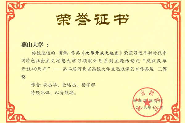 在“庆祝改革开放40周年”——第二届河北省高校大学生思政课艺术作品展中,由安志华、金远志、杨宇程同学完成的剪纸作品《改革开放天地宽》荣获二等奖,由王星越同学完成的十字绣作品《庆祝改革开放40周年》荣获三等奖,由孙云浩同学完成的设计作品《铁路先行》荣获三等奖,由李季珍同学完成的书法作品《大道之行,天下为公》荣获三等奖。