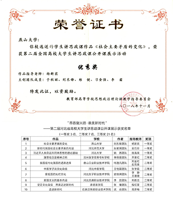 在“昂首复兴路·最美新时代”——第二届全国高校大学生讲思政课公开课展示活动中,由我校马克思主义学院杨新宾副教授指导、学院研究生于秋丽(主讲)、刘东峰、郑健、刁金强、李霜团队完成的《社会主要矛盾的变化》一课喜获燕山大学第一名、河北省一等奖以及全国高校优秀奖。“昂首复兴路·最美新时代”——第二届全国大学生讲思政课公开课展示活动由教育部社科司指导、教育部全国高校思想政治理论课教学指导委员会主办、南开大学马克思主义学院承办。本届教学公开课展示活动自今年6月中旬开始启动,经过高校推荐和省级初赛,共有全国30个省区市一百余所高校推荐的104份作品参加复赛,经专家评委和学生评委的网络评审,最后共有64份作品获得表彰。