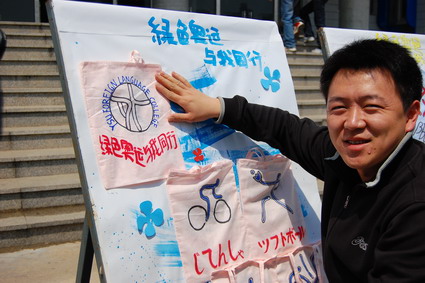 【新闻中心讯】为响应国务院办公厅2007年12月31日下发的《关于限制生产销售使用塑料购物袋的通知》和2008北京绿色奥运会的理念,4月27日,我校外国语学院举行了“绿色奥运,与我同行”环保布袋展活动。