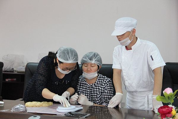 烘焙体验暨诗词鉴赏会邀请到了专业的面点师傅为教师讲解月饼的由来和月饼的制作步骤,引起了老师们的兴致。老师们按照面点师傅讲解的操作步骤,严格为月饼皮和馅料称重,捏好月饼皮的形状后裹上各式馅料,再放入模具中均匀压实,倒模扣出。经过一阵忙碌,桌子上便出现了各种花式的月饼,老师们在制作过程中欢声笑语。