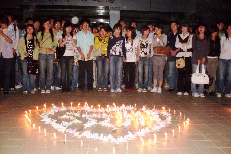 【新闻中心讯】5月12日,四川大地震发生,为了悼念死去的同胞,也为了激励幸免于难的人,更为了祝福那些战斗在抗震救灾一线的武警战士、白衣天使,机械工程学院雷锋突击队于5月21日中午在二食堂门口号召同学们折千纸鹤为灾区人民祈福,并于晚10点半在大学生活动中心门口点燃蜡烛为灾区祈祷,愿逝者安息,生者平安。