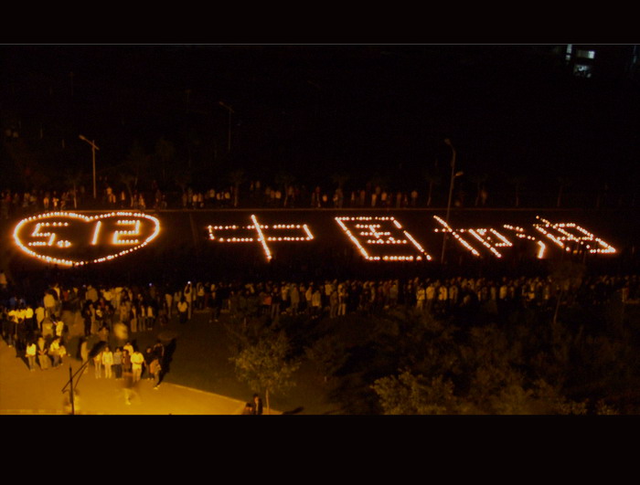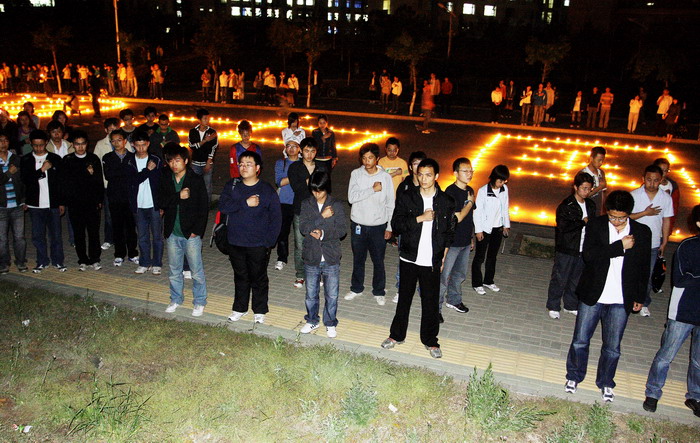 晚上22点整,约630余名同学来到西校区八、九组团旁的马路上,按照提前布置好的站位迅速站到了事先画好的图形上。全部同学到位后,大家共同点燃蜡烛,摆出了“爱心献给5·12”和“中国加油”的图案。随着周围同学越来越多,大家共同为遇难同胞默哀三分钟。随后,全体同学高喊“中国加油!汶川加油!”,高唱国歌,为灾区、为祖国送去了最真挚的祝福。