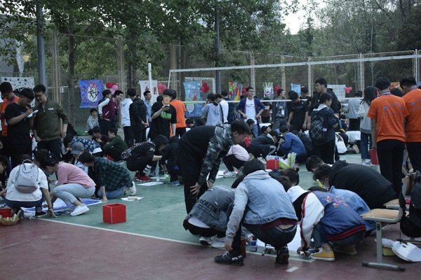 本次比赛以“青春正当时,奋进新时代”为主题,经过广泛宣传,共有来自13个学院18支队伍参赛。在一段富有激情的开场舞和精彩纷呈的开场视频后比赛拉开了序幕,赛场内,参赛的各学院队伍围绕着既定主题,用手中的画笔和斑斓的色彩,淋漓尽致地展现自己的画工;用独具匠心的构思与创意,让缤纷的色彩搭乘创意的翅膀在画布上自由飞翔。赛场外,观众们即可观看各参赛队伍绘画过程,也可欣赏歌舞表演、参与到游戏环节中。