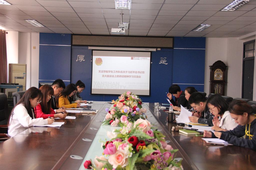 【新闻中心讯】在五四青年节到来之际,习近平总书记在北京大学师生座谈会上发表了重要讲话,在全国青年学生和教育工作者间引起了热烈反响。文法学院党委积极组织,于5月4日上午和下午分别组织学院学生工作团队及学生骨干,开展了学习习近平总书记重要讲话精神的专题座谈会。文法学院党委书记刘叶涛,党委副书记杨健民出席座谈会。