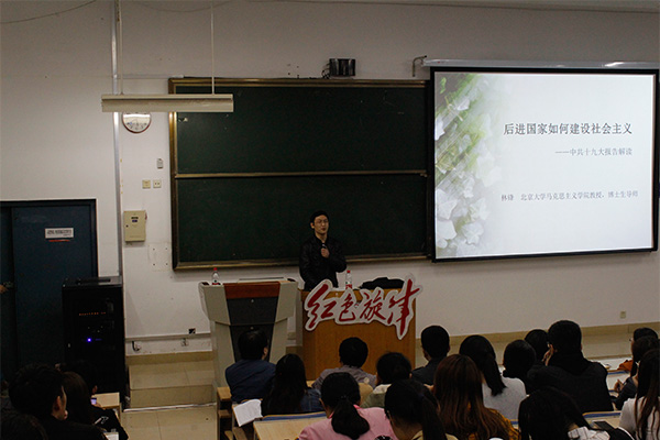 【新闻中心讯】4月27日晚7:30,由马克思主义学院举办,校团委、里仁学院协办,马克思主义研究会承办的第一百二十五期“红色旋律”讲坛在东校区第四教学楼109教室举办。本期讲坛的题目是《后进国家如何建设社会主义——党的十九大报告解读》,由北京大学马克思主义学院林锋教授主讲。