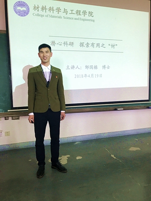 邹国栋以《人间词话》为切入点,并借用王国维先生的三句话结合自己的课题研究经验,提出做科研的三种阶段“立志——坚持——收获”,讲述了自己与科研的不解之缘。随后,邹国栋将自己研究生期间积累的查找文献、论文写作等方面的宝贵经验和大家做了详细的分享,对自己总结的行之有效的方法进行了重点推荐;最后,作为一位学长,他对参会的师弟师妹提出了包括身心健康、为人处事、科研学习在内的宝贵建议和深切期望,希望材料学子依托学院大好科研平台,弘扬艰苦奋斗的燕大精神,不忘初心、砥砺前行,成就美好的明天。