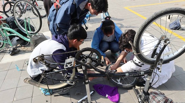 自行车协会成员正在为同学修车服务