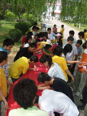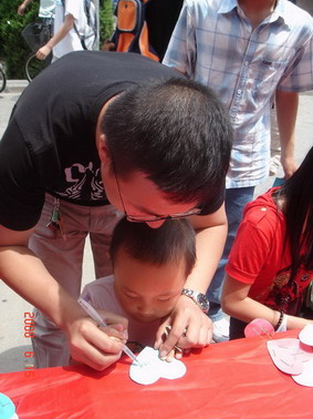在灿烂的阳光下,信息学院学生会工作人员忙碌着向过往的同学发送心形彩色纸片。同学们在卡片上写下了对父亲的衷心祝福,然后自己用丝线缝制在准备好的横幅上。成百上千的彩色卡片组成了“父爱如山”四个大字,悬挂在燕鸣湖畔,格外醒目。在音乐背景下,现场工作人员深情朗诵着祝福父亲的诗歌,同学们都深受感染。