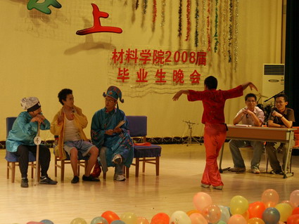 相声《工作与爱情》演绎了同学们身边的逸闻趣事,令人忍俊不禁;而《奥运志愿者》、《梦幻西游》、《三顾茅庐》、《梁祝》等小品、短剧及别出心裁的个性走秀,令全场师生爆笑不断、掌声与喝彩声此起彼伏,全场观众、演员沉浸在欢声笑语的海洋之中。舞蹈《Dream Party》、《情字路上》让全场观众感受到平日里刻苦攻读的材料专业同学们活泼、亮丽的青春朝气。幻灯片《我们毕业了》、歌声《跟往事干杯》以及毕业班辅导员郭宇星老师的散文诗朗诵《相逢有涯》,将晚会依依惜别的气氛推向高潮。最后,这个令全体毕业生刻骨铭心的晚会在一曲《在路上》圆满结束。
