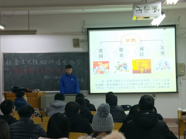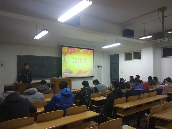 活动开始前,17级辅导员周爽老师带领各班团支书,通过PPT展示,对“富强、民主、文明、和谐,自由、平等、公正、法治,爱国、敬业、诚信、友善”24字社会主义核心价值观进行了诠释,并逐条展开进行讲解,鼓励和动员同学们在实际行动中践行社会主义核心价值观。会后,各班团支书针对所学内容在各个团支部内部组织学习活动。