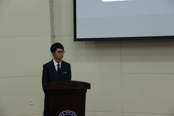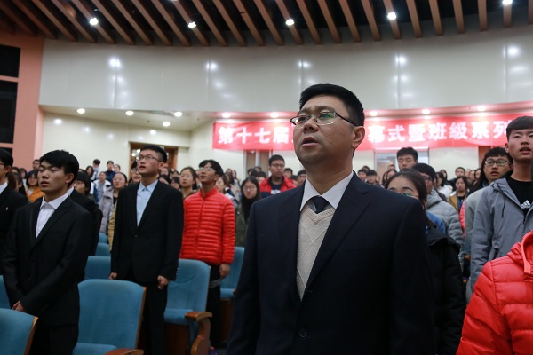 开幕式在奏唱国歌中拉开帷幕,随后,杨健民为本次开幕式致辞并进行授旗。他指出人文节作为我院一项重要的特色活动已走过十六载,今年积极响应党的十九大精神内涵,坚持传统并贯彻落实社会主义核心价值观,促进校园文化建设。授旗后,文法学院学生会秘书长宋嘉奇作为学生会代表发言。一首深情的《我爱你,中国》后,“高颂古往今来事,文载满腔赤子心”班级系列活动答辩正式开始。来自2017级的9位学生代表依次上台答辩,针对各自的活动策划进行了详细清晰的讲解,其中涉及到民族文化、社会主义核心价值观、知识竞猜等丰富内容。评委在每位代表阐述完毕后针对性提问,并提供了相关建议。