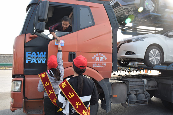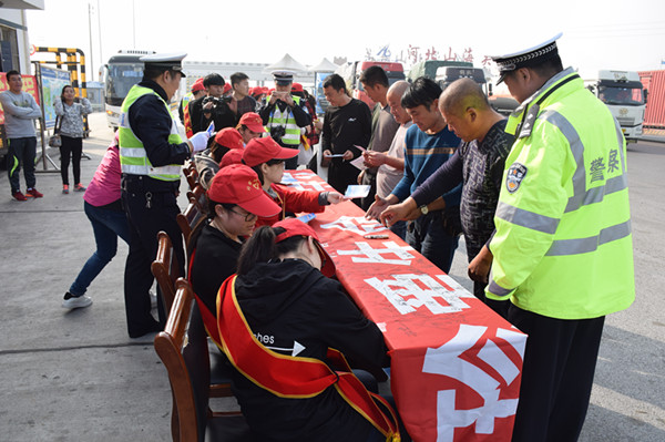 下午14时,在材料科学与工程学院党委书记王丽萍、副党委副书记袁云岗老师的带领下,材料学院26名党课培训班学员、6名教师党员到达活动现场,与高速交警秦皇岛支队政委郭京国、秦皇岛大队教导员王振永、秦皇岛大队民警等共计40余人共同参加了此次的活动。活动开始后,王丽萍书记和郭京国政委先后对参加活动的师生和民警进行了动员讲话,嘱托学院师生珍惜走出校门、亲身体验社会的机会,针对交通安全宣传内容进行了讲解。随后,师生和民警结成两组,分工合作。一组负责给司机师傅讲解安全行车,正确处理紧急事故的注意事项,帮助大家树立安全交通意识;二组负责发放交通安全宣传资料,解答司机师傅的疑问,和开展众人签名活动。