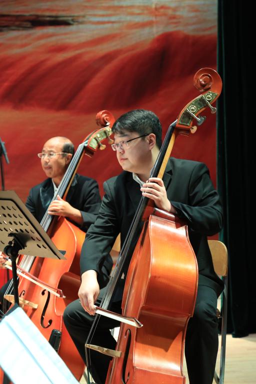 丛玉婷表演了经典曲目《黄河钢琴协奏曲》全乐章,整部作品气势如虹,如九曲黄河水,时而百转千回,时而排山倒海,于细腻中见磅礴,于柔美中见雄浑,精彩的演出赢得了热烈掌声。冯师野作为首席低音提琴,全程参加了演奏,展现出了高水平的专业素质。