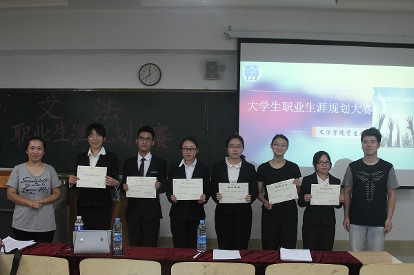 【新闻中心讯】9月13日晚6点半,文法学院第九届职业生涯规划大赛在第四教学楼313举行。文法学院学生科科长金宏妍、团委副书记王奕骅、2014级辅导员谢波老师出席本次比赛并担任评委。2015级政治学与行政学专业梁赛阁同学获得本次比赛的一等奖。
