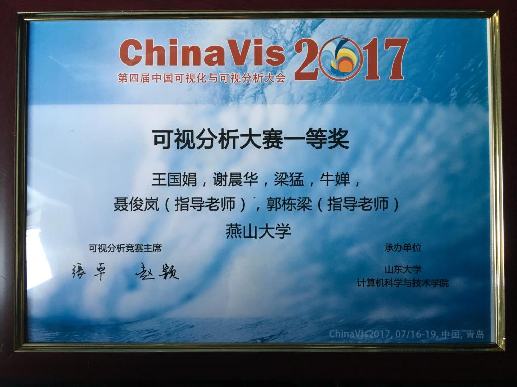 【新闻中心讯】近日,第四届中国可视化与可视分析大会(ChinaVis2017)在山东青岛举行。在本届会议的数据可视分析挑战赛环节,我校信息科学与工程学院教师聂俊岚、郭栋梁指导的王国娟、谢晨华研究生团队从全国68支参赛队中脱颖而出,与天津大学、东北大学并列获得挑战赛一等奖,这是我校蝉联该赛事最高荣誉。在2016年的第三届中国可视化与可视分析大会上我校也获得了该项赛事一等奖。