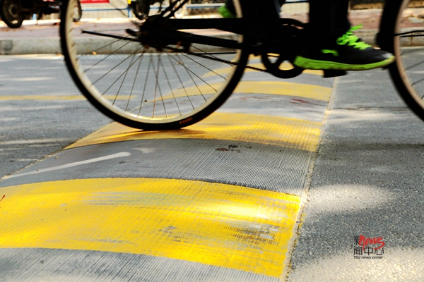 宿舍区的燕西路路面重修后铺设了5条崭新的减速带,骑自行车记得减速(刘蕊)