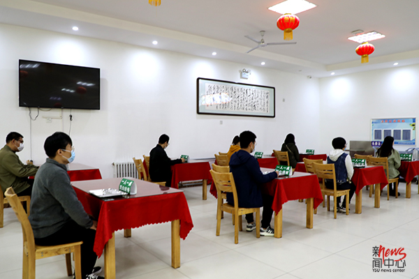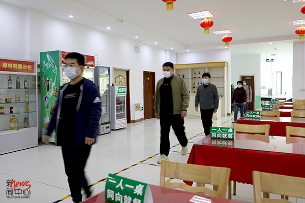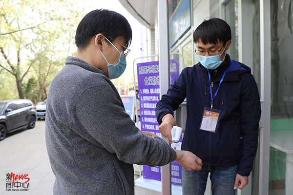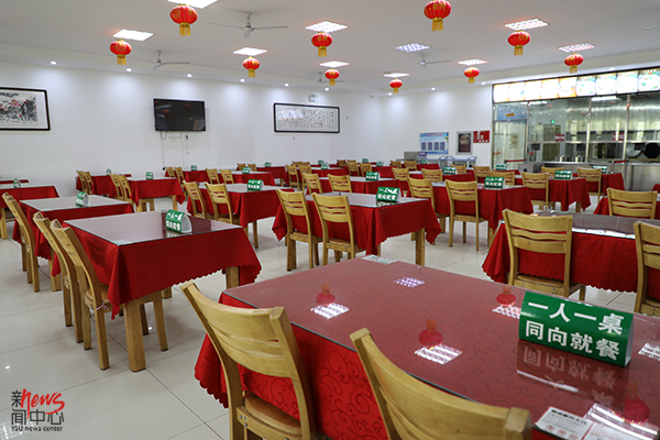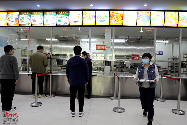 学生陆续进入东校区第三学生食堂,由食堂安排专人用手持测温枪对学生进行测温。体温正常学生进入餐厅,陆续在相应档口排队买完饭菜后,根据地标指示离开排队区到餐厅座位同向就餐,提倡购买后回宿舍就餐。对出现体温发热学生等突发情况进行了演练。