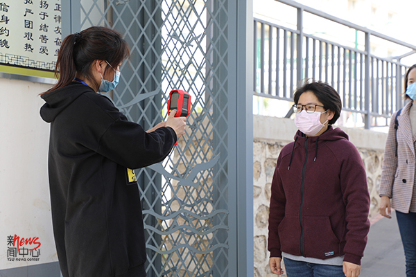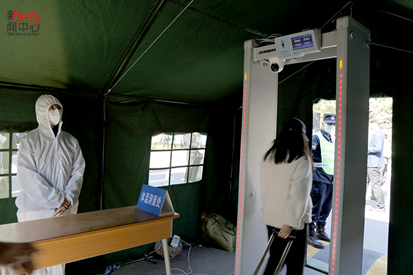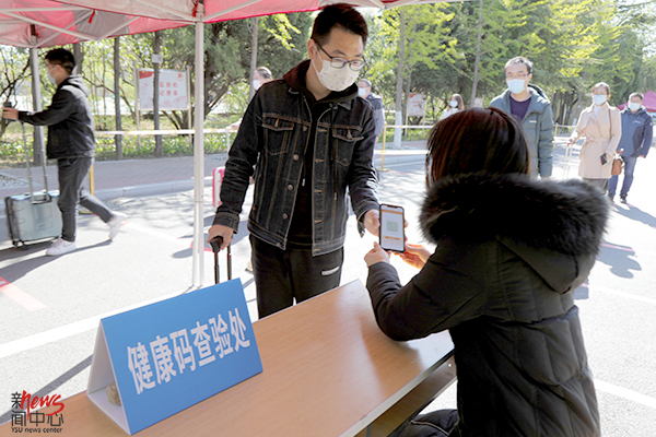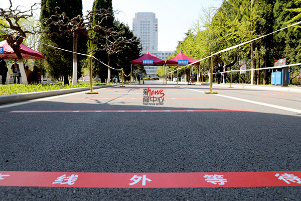 在一卡通身份认证区,返校学生间隔1米有序进行身份认证。一名“暂缓返校学生”被识别并立即送至学校集中隔离观察场所。