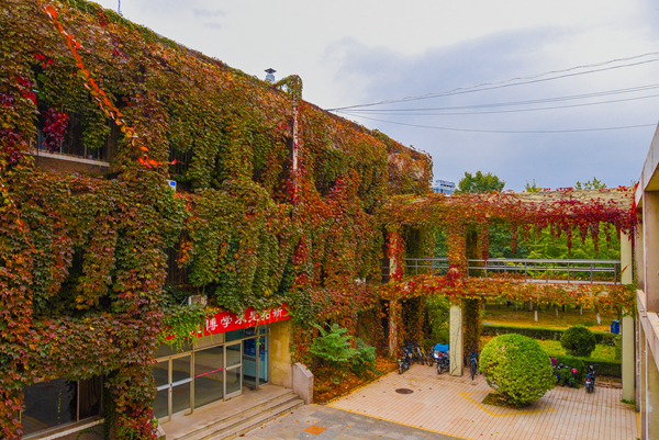 “秋”小姐是个心灵手巧的姑娘,看,我们满墙的爬山虎那是她为我们的教学楼新织就的华裳
