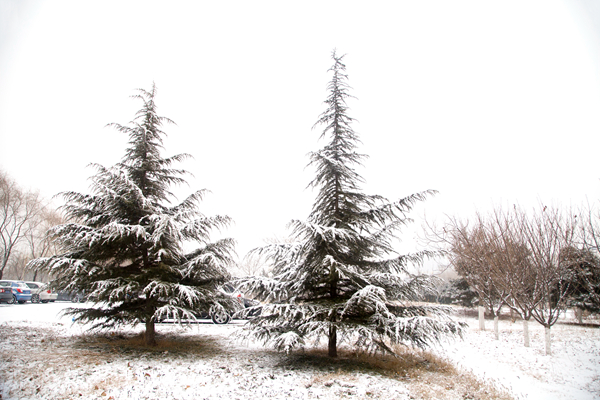 门前的两棵松,像撒了糖霜的圣诞树