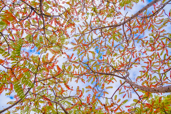 绚丽的色彩是秋的容颜,梦幻的纹理是秋的外衣,将红未红的枝叶交错纵横,像是在拥抱,像是在问候到来的你