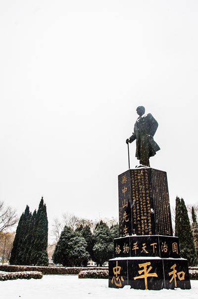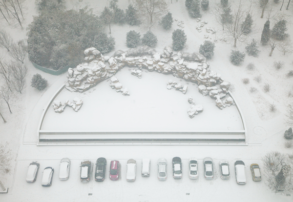 雪为雄伟雕像增添了一抹肃穆