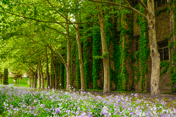春天的魔法让校门口的景象变得充满生机