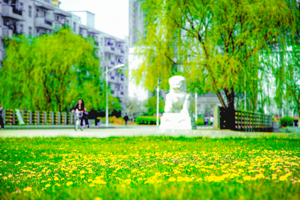 黄绿相间的草地,婀娜多姿的柳树,合着来来往往的行人,美成了一幅画