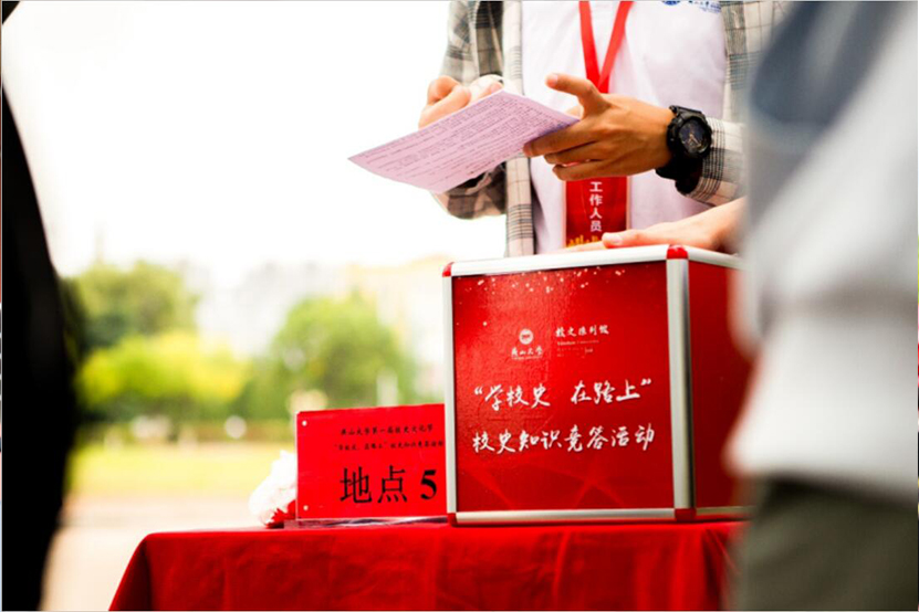 燕山大学“第一届校史文化节”系列活动之“学校史、在路上”校史知识竞答活动,深受在校学生的喜爱。精心设计的宣传海报和书签、统一布置的八个答题地点、装满红色题号球的抽号箱、精美的工作胸牌和竞答地图、各种款式的通过贴纸、吸人眼球的燕宝人偶、具有实用价值的奖品……参与者随机抽题并现场作答,好一场寓教于乐的校园文化活动!