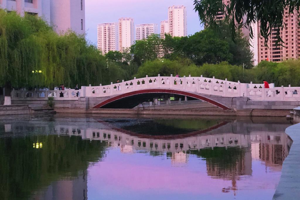 傍晚的霞光,给燕鸣湖上的桥披上一层朦胧、柔和的面纱