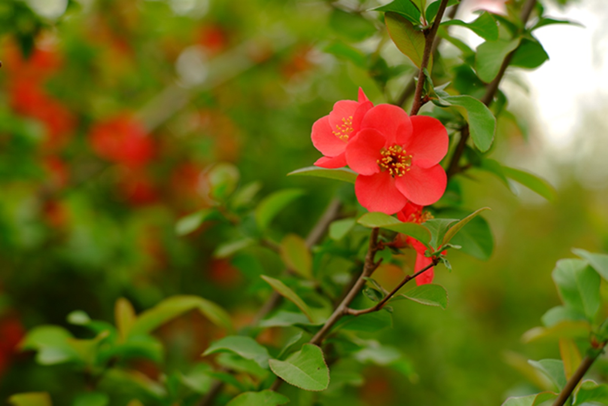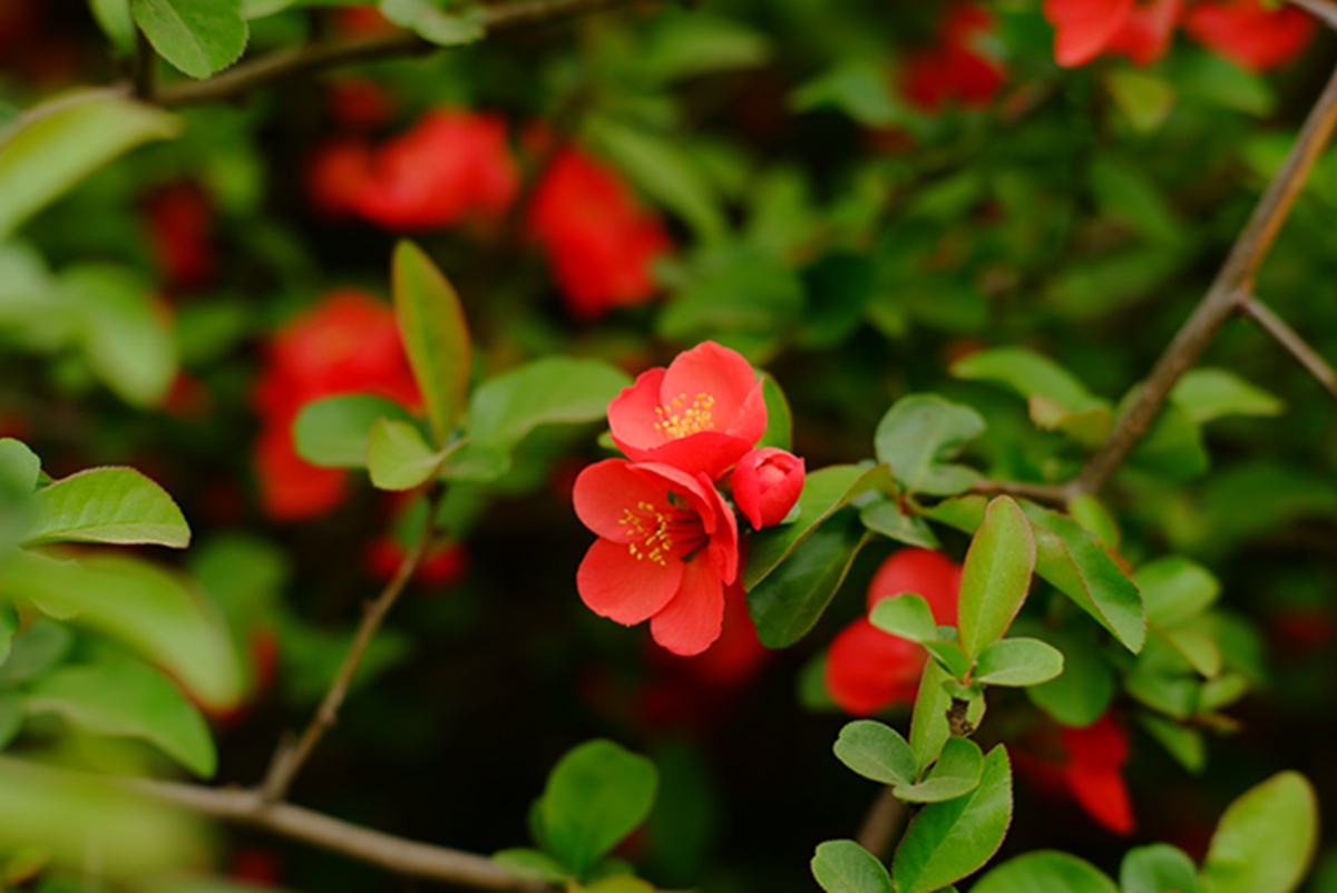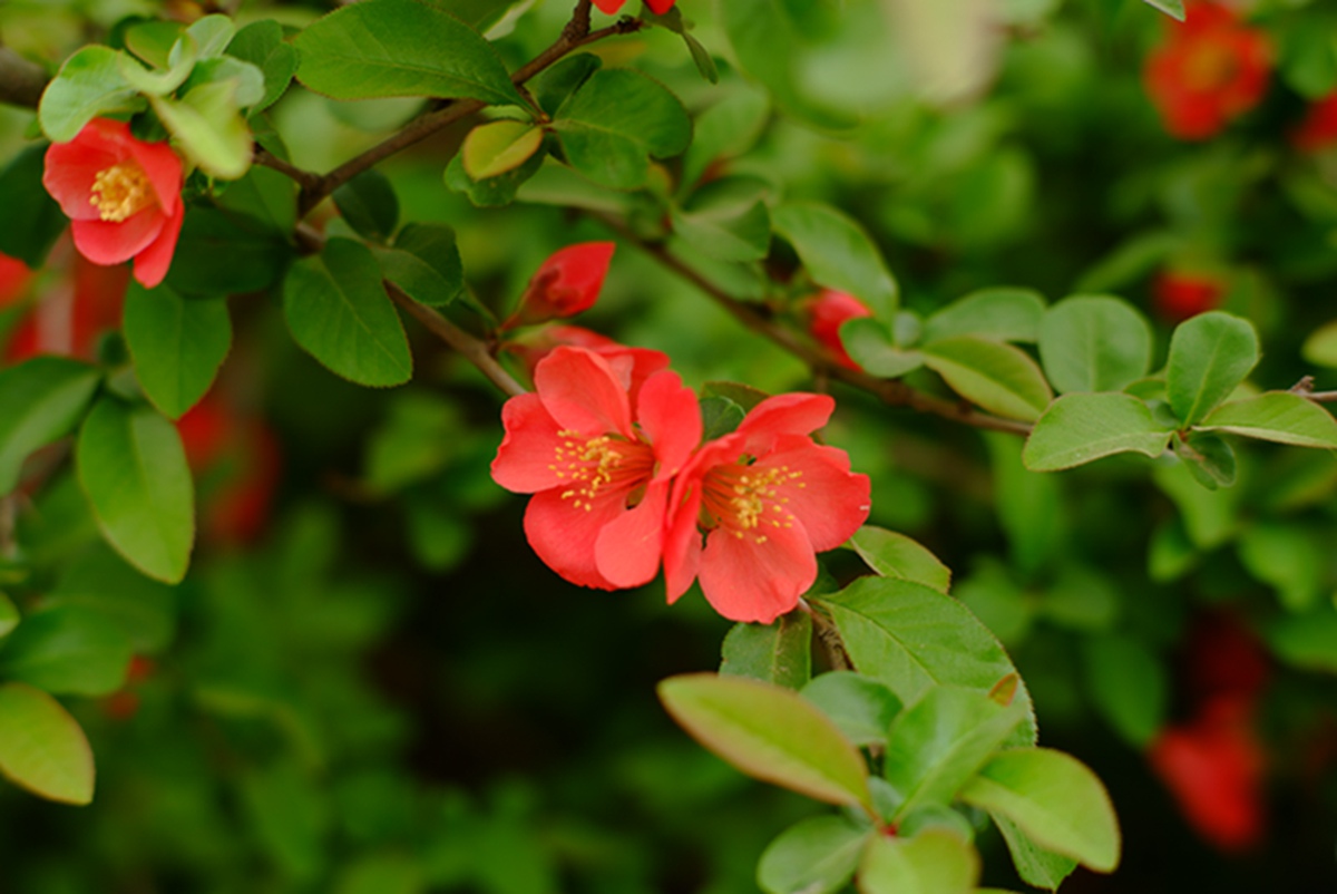 贴梗海棠是蔷薇科木瓜属植物,其枝秆丛生,枝上有刺,其花梗极短,花朵紧贴在枝干上,故名。