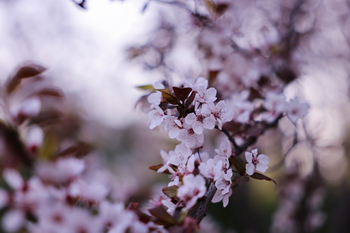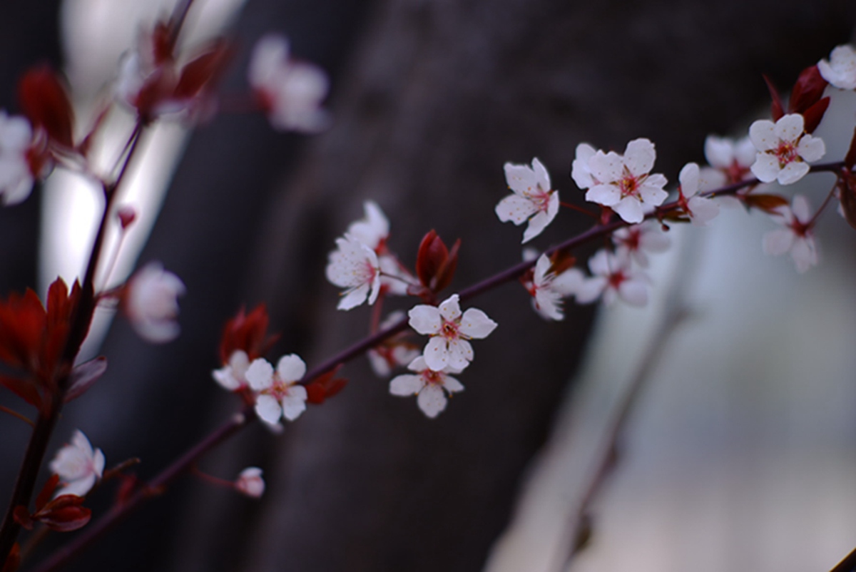 校园里的李花大多都是紫叶李(红叶李),叶子呈紫红色,花色纯白。紫叶李是常见的小乔木。