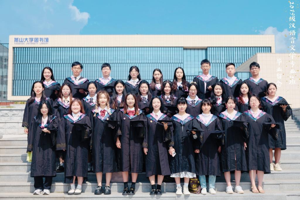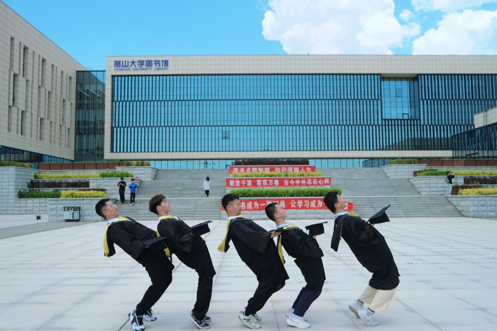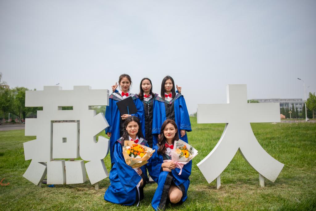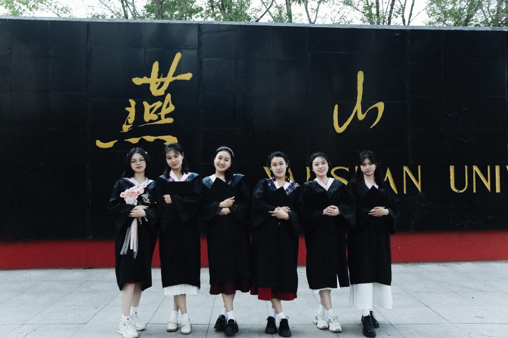 怀抱鲜花,我们站在“燕大”旁微笑告别